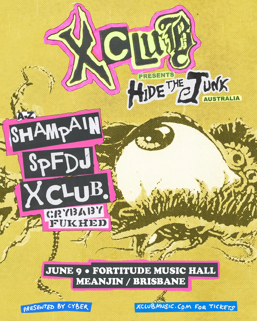 CYBER is pleased to present X CLUB. at The Fortitude Music Hall, bringing their HIDE THE JUNK curated parties back home to Brisbane! Having made their name on the global stage, X CLUB. have announced their return to Australia for their biggest headline shows to date, as they present HIDE THE JUNK, a day into night rave featuring an international star-studded lineup of house & techno’s finest. Always pushing the boundaries in music programming and scene setting, X CLUB. will be joined by underground techno leader SPFDJ (Sweden) and G-Town hero, SHAMPAIN (Ireland). This unique space paired with X CLUB.'s audio & visual rave experience, will deliver the return that fans Australia wide have been demanding. Tickets for X CLUB. raves are a hot commodity. Register for the pre-sale to secure your tickets right away!