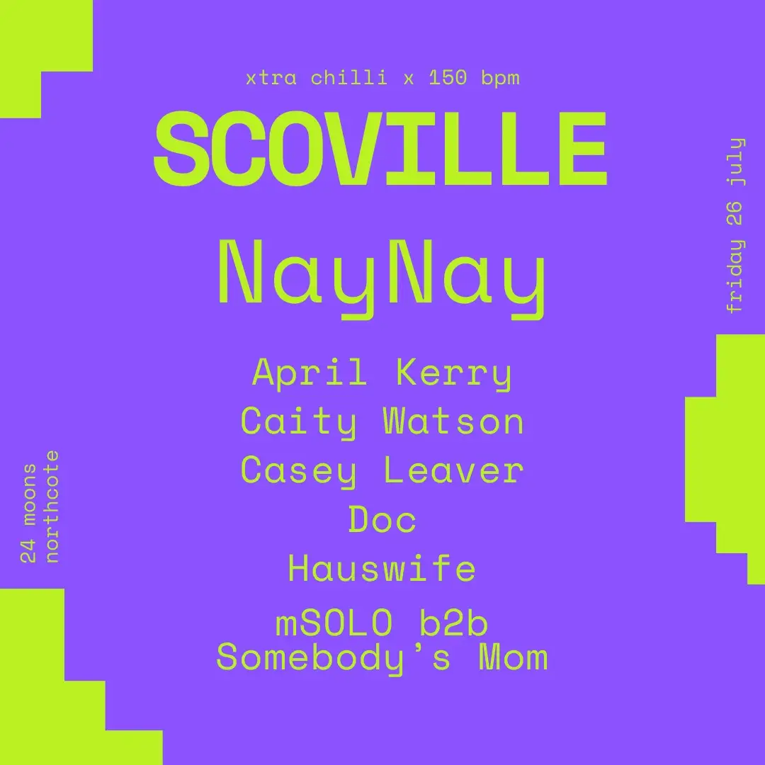 SCOVILLE - here we goooooo! Xtra Chilli and our friends at 150 BPM are turning up the spice for a night that will leave your tastebuds happily tingled. Expect a journey from fun house beats to serious techno, with a variety of heat levels to match your spice preference. Our 75% female, 100% slayer lineup has landed, and we’re sure it’s got adequate heat for everyone. Get ready for tight baselines and sick drops from start to finish - you don’t want to be saying Nay to this one. LINEUP: - NayNay - April Kerry - Caity Watson - Casey Leaver - Doc - Hauswife - mSOLO b2b Somebody's Mom Event Details: Date: Friday 26th of July Time: 9pm - 4am Location: 24 Moons Ticket prices: $25 / $30 / $35 It may be a cold winter's night, but we’ll keep you warm inside. Strictly 18+ - We acknowledge the traditional custodians of the land this event is taking place upon, the Wurundjeri People of the Kulin Nation, and we pay our respects to their Elders of past and present. There is a strict zero tolerance policy towards racism, homophobia, transphobia, sexism, ableism or harassment of any kind. Please report any unwelcome behaviour to staff or event organisers. There will be some strobe lights/LED blinders used in performances.